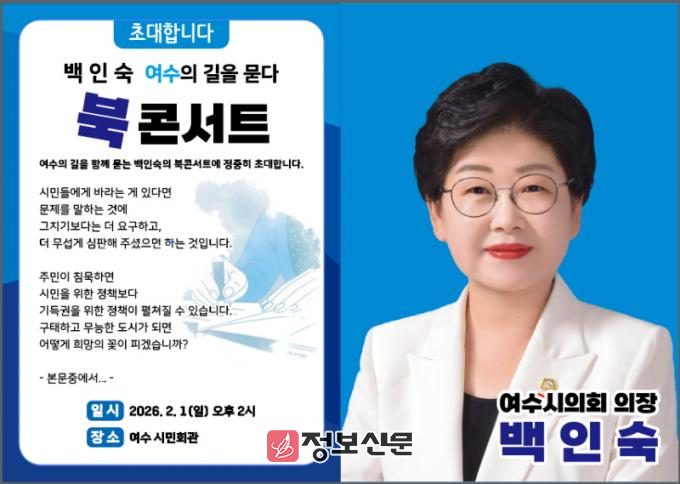 이번 북콘서트는 여수 최초 여성시의장이자 3선 시의원인 백인숙 의장이 정치에 나선 이유와 시민과 함께 걸어온 현장의 기록, 여수의 현재와 미래에 대한 문제의식을 책으로 정리해 시민과 직접 나누는 자리로 마련됐다. 단순한 출간 행사가 아니라 시민과의 대화를 중심에 둔 소통형 북콘서트로 진행된다.