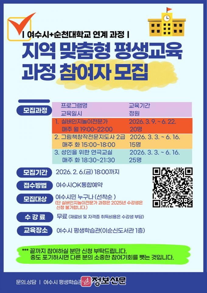 이번 사업은 여수시와 순천대학교가 협력하여 지역 특성과 시민의 학습 수요를 반영한 맞춤형 평생교육을 운영함으로써, 시민의 학습역량을 높이고 전문성을 강화하기 위해 마련됐다. 모집 과정은 ▲실버인지놀이지도전문가 ▲그림책창작전문지도사 2급 ▲성인을 위한 연극교실 등 총 3개 과정이다.