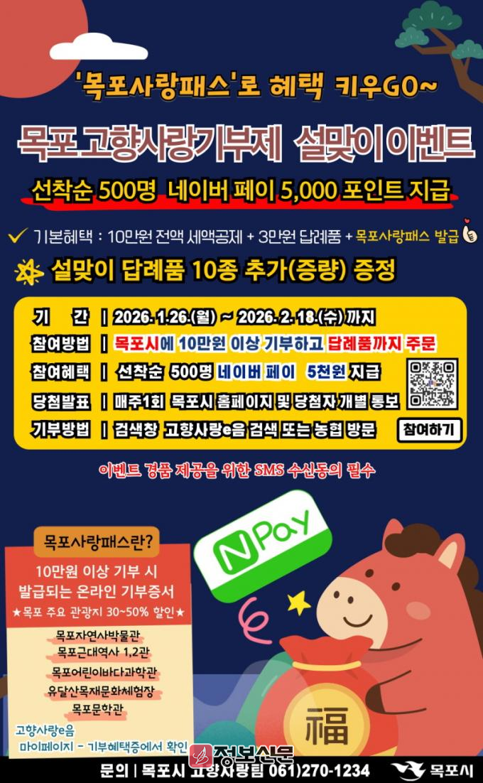 ![]() 목포시, 고향사랑기부제 설맞이 이벤트 ‘목포사랑패스’로 혜택 키우GO~ 진행 |