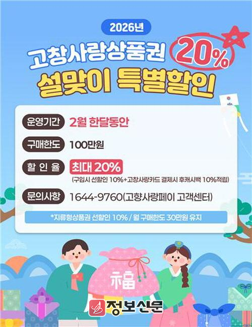 ![]() 고창군, 설 명절 맞이 고창사랑상품권 최대 20% 할인판매 실시 |