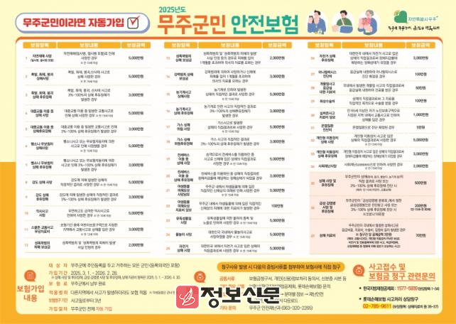 배점옥 무주군청 안전재난과 안전민방위팀장은 “무주군민이면 별도의 가입 절차 없이 자동으로 보험 혜택을 받을 수 있다”라며 “예기치 못한 사고와 재난으로 인해 어려운 상황에 부닥친 군민이 하루빨리 일상으로 복귀할 수 있도록 뒷받침하는 데 최선을 다할 것”이라고 밝혔다.