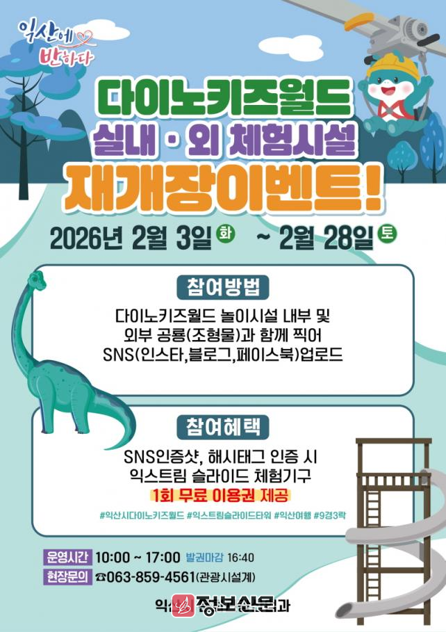 익산시는 재개장을 기념해 2월 3일부터 28일까지 이벤트도 진행한다. 다이노키즈월드 실내외 놀이시설과 함께 찍은 사진을 개인 사회관계망서비스(SNS)에 게시한 뒤 매표소에 인증하면, 익스트림 슬라이드 1회 무료 이용권을 받을 수 있다.