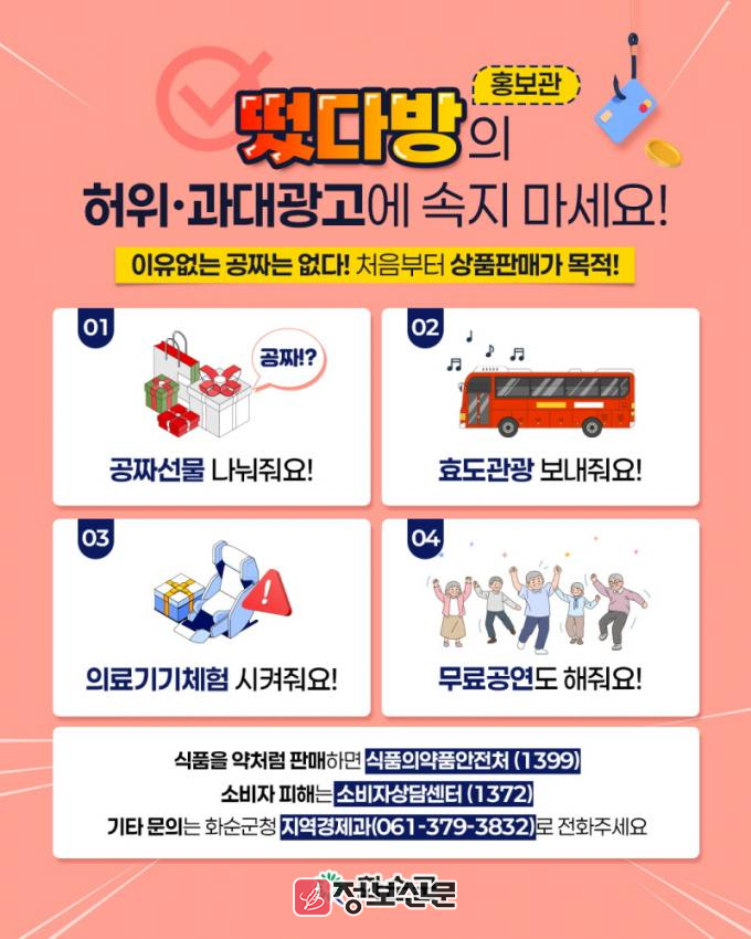 또한, 피해가 생겼을 경우 식품안전 관련 위법행위는 식품의약품안전처(☎1399), 소비자 피해는 소비자상담센터(☎1372)에서 신고할 수 있으며, 기타 문의는 화순군청 지역경제과(☎379-3832)로 하면 된다.