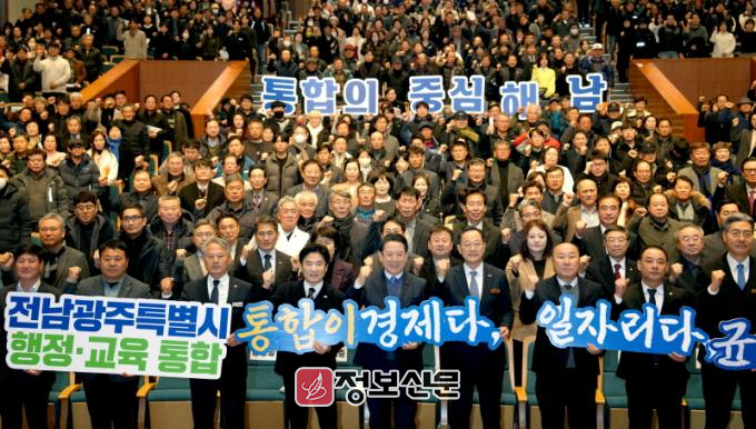 김영록 지사는 이날 서남권 3개 군 공청회에서 “해남·진도·완도는 농수산업과 해양관광을 기반으로 재생에너지·해양치유·AI·데이터센터 등 전남의 미래비전을 현실화할 성장 잠재력이 큰 지역”이라며 “행정통합을 통해 첨단산업과 해양·농수산 경쟁력을 강화하고 관광·정주여건 개선 등 서남권 도민이 체감할 변화를 만들겠다”고 강조했다.