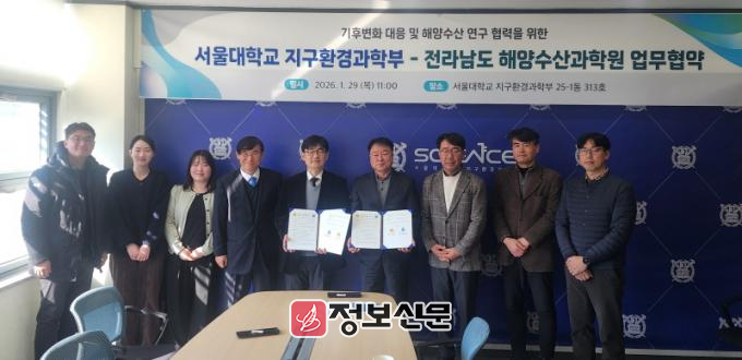 전라남도해양수산과학원(원장 김충남)과 국립대학법인 서울대학교 지구환경과학부(학부장 박록진)는 29일 서울대학교에서 ‘기후변화 대응 지속 가능한 해양수산 연구 체계 구축’을 위한 업무협약(MOU)을 했다.