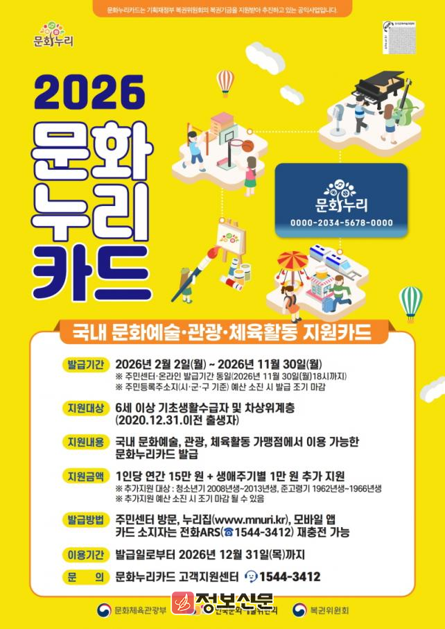 한편, 문화누리카드 발급 및 이용처 관련 자세한 사항은 거주지 읍·면·동 행정복지센터, 문화누리카드 누리집(www.mnuri.kr) 및 고객센터(☎1544-3412) 등을 통해 안내받을 수 있다.