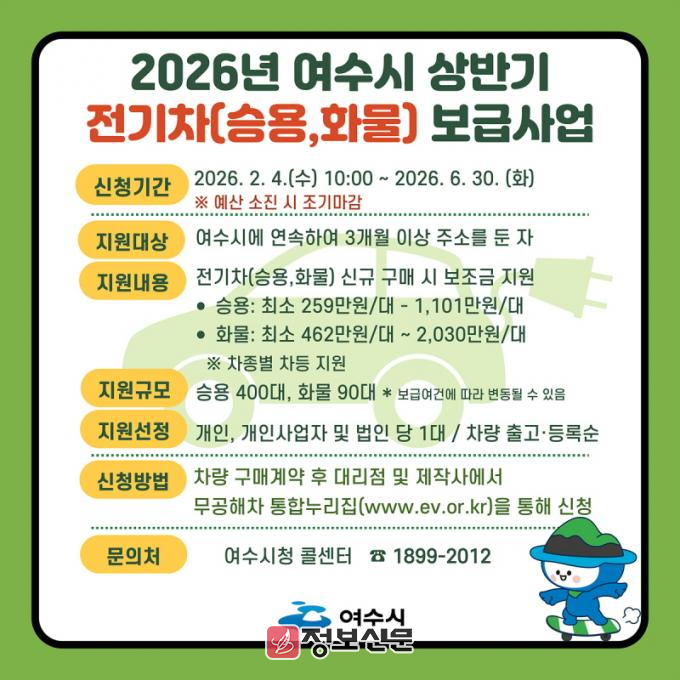 ![]() 여수시, 2026년 상반기 전기차 구매보조금 확대 지원사업 추진 |