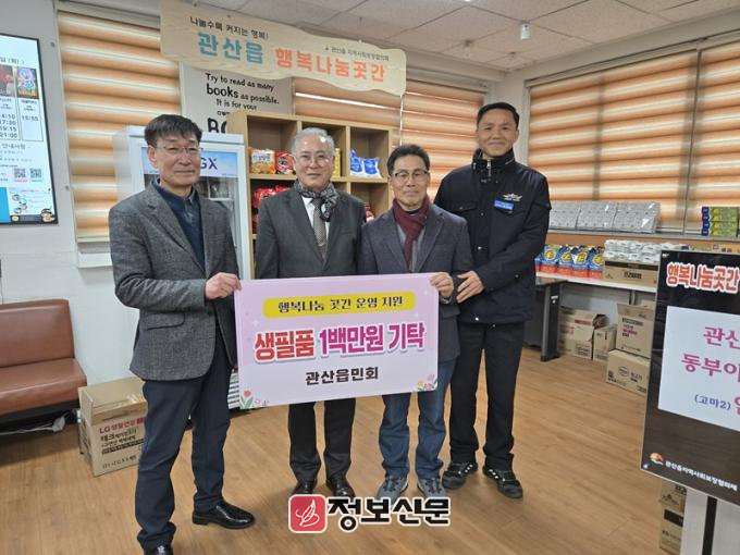 유양선 관산읍장은 “어려운 이웃을 위해 소중한 물품을 기부해 주신 관산읍민회에 깊이 감사드린다”며, “십시일반의 마음으로 이어지는 ‘행복나눔곳간’이 지역 사회의 든든한 버팀목이 될 수 있도록 앞으로도 촘촘한 사회안전망 구축에 최선을 다하겠다”고 밝혔다.