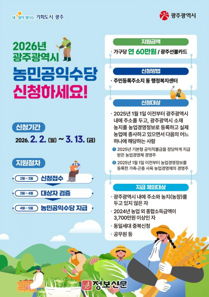 ![]() 광주광역시, 2026년 농민공익수당 신청 접수 |