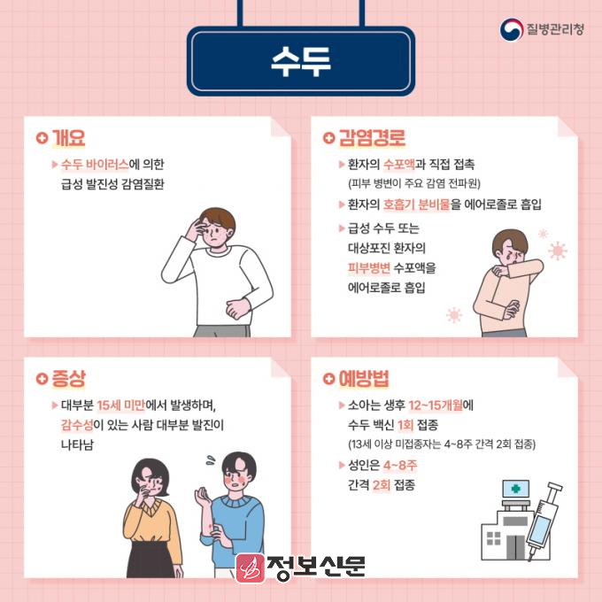 수두는 수두-대상포진 바이러스에 의해 발생하는 제2급 법정감염병으로 겨울에서 봄철에 유행하고 주로 소아에게 발생하며 전염력이 매우 높은 것이 특징이다.