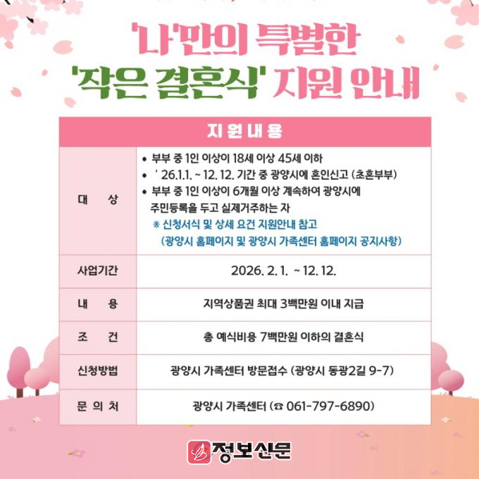 광양시 관계자는 “이번 작은 결혼식 지원사업이 신혼부부의 경제적 부담을 완화하고, 지역 여건에 맞는 건전한 결혼문화 확산에 도움이 되길 바란다”고 말했다.