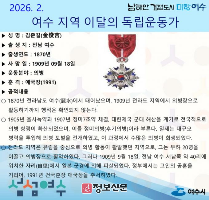 ![]() 여수시, 2026년 2월의 독립운동가 ‘김준길(金俊吉)’ 선생 선정 |