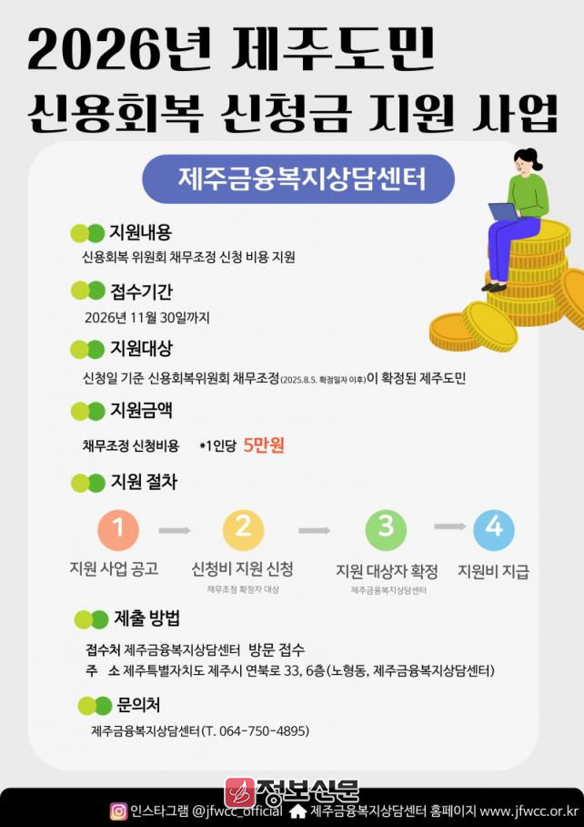![]() 제주금융복지상담센터, 2026년 제주도민 신용회복 신청금 지원 사업 추진 |