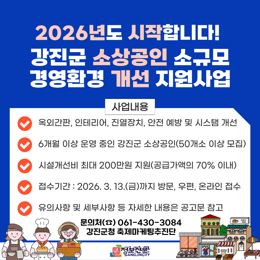 ![]() 강진군, 소상공인 경영환경 개선사업 신청하세요 |