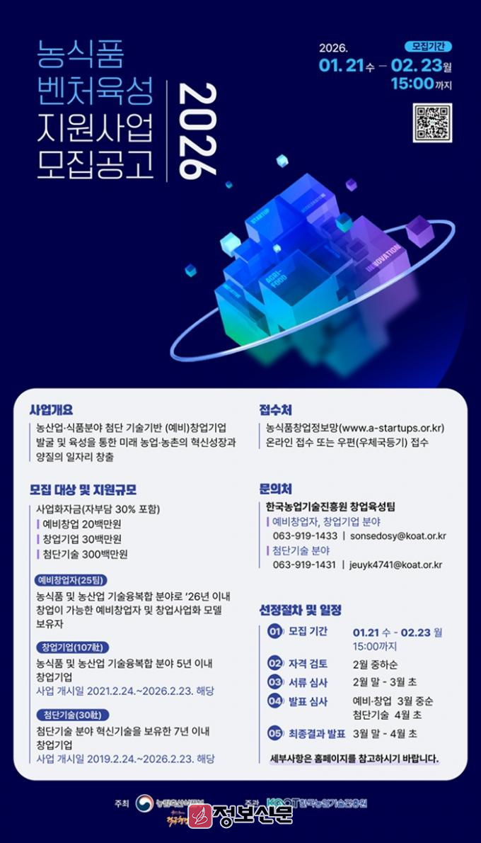 2026년 농식품 벤처육성 지원사업은 농식품 분야 예비창업자와 창업 초기 기업, 첨단기술을 접목한 유망 벤처기업을 대상으로 사업화 자금과 성장 지원을 제공하는 사업이다. 오는 23일까지 농식품창업정보망(www.a-startups.or.kr)에 접수하면 된다.