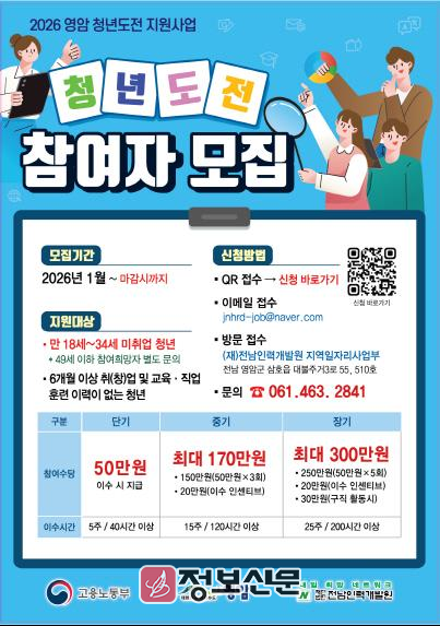 ![]() 2026년 영암군 청년도전 지원사업 참여자 모집 포스터 |