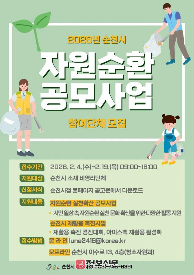 ![]() 순천시, 2026년 자원순환 공모사업 참여 단체 모집 |