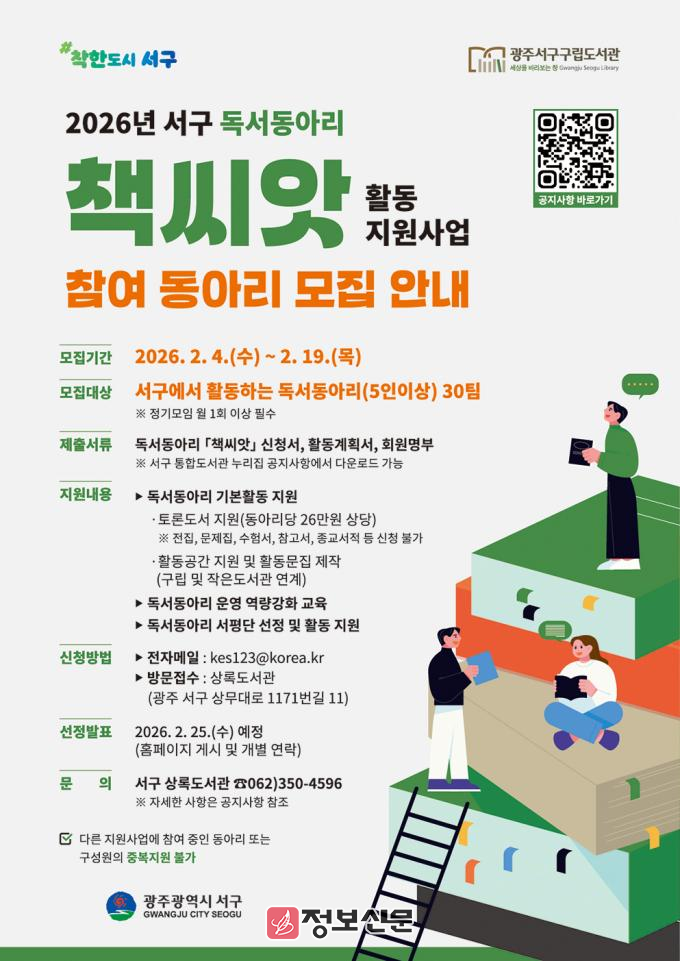 김이강 서구청장은 “주민들이 함께 읽고 함께 나누는 생활 독서가 일상에 자리 잡을 수 있도록 독서동아리 ‘책씨앗’ 사업을 지속적으로 추진하겠다”며 “올해도 많은 독서동아리가 적극 참여해 주길 바란다”고 말했다.