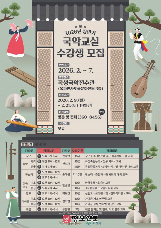 ![]() 곡성국악전수관, 2026년 상반기 국악교실 수강생 모집