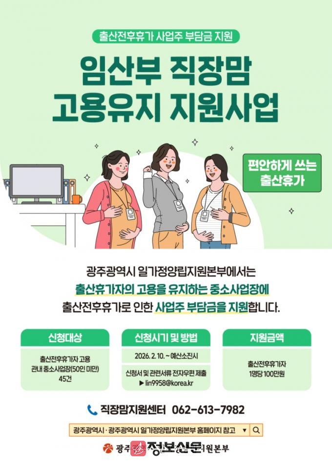 지원 대상은 출산 전후 휴가 기간 임산부의 고용을 유지하는 광주지역 50인 미만 중소사업장이며, 임산부 직원 1명당 100만원을 지원한다.