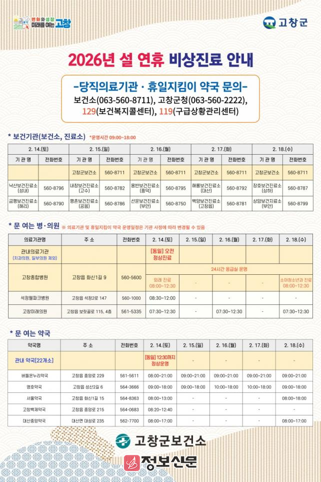지역응급의료기관인 고창종합병원은 응급환자 발생을 대비해 24시간 응급실을 운영한다. 보건기관 11개소, 당직 병·의원 26개소, 약국 22개소가 일자별 지정 운영할 계획이다. 연휴 14일(토요일)에는 대부분의 관내 의료기관에서 오전에 정상 진료가 이뤄진다.