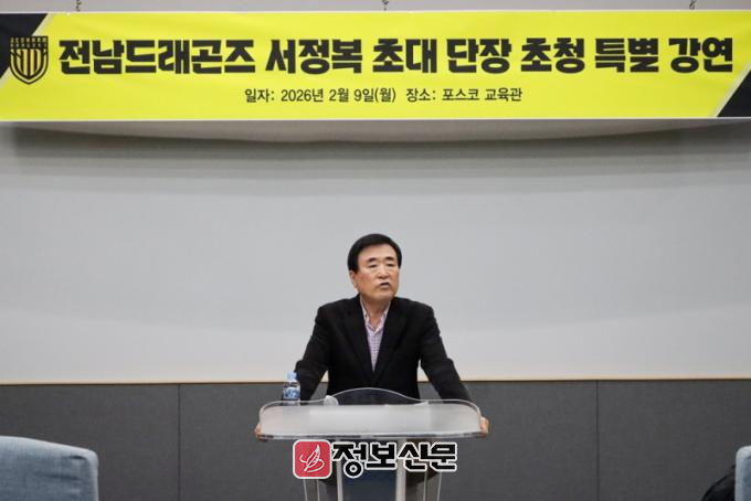 전남은 2월 9일 월요일 오전 전남드래곤즈 초대·4대 단장을 역임한 서정복 전 단장을 초청해, 프로선수단 대상으로 특별강연을 진행했다. 이번 강연은 2026시즌을 앞두고 선수단에 전남드래곤즈의 창단 철학과 프로선수로서의 책임을 공유하고, 팀 결속력과 동기부여를 강화하기 위해 마련됐다.