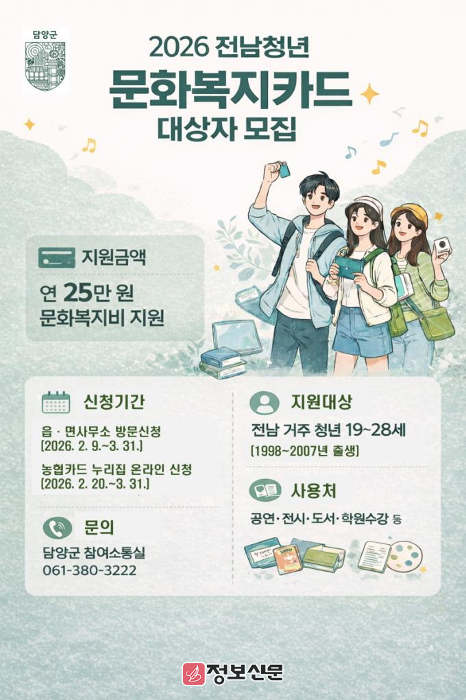 담양군 관계자는 “전남청년 문화복지카드 지원사업을 통해 청년들의 문화 참여 기회를 넓히고 삶의 질을 높이는 계기가 되길 바란다”라며 “앞으로도 청년의 수요를 반영한 문화·복지 정책을 추진해 청년이 머물고 성장할 수 있는 담양을 만들어 가겠다”라고 말했다.