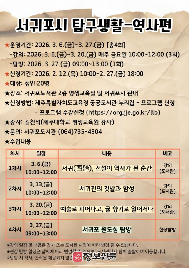 이번 1분기 프로그램인 ‘서귀포시 탐구생활–역사편’은 김천석 제주대학교 평생교육원 강사의 지도로 총 4회 과정으로 운영되며 옛 기록 속 서귀포의 역사와 원도심에 남겨진 예술인의 삶을 심도 있게 살펴볼 예정이다.