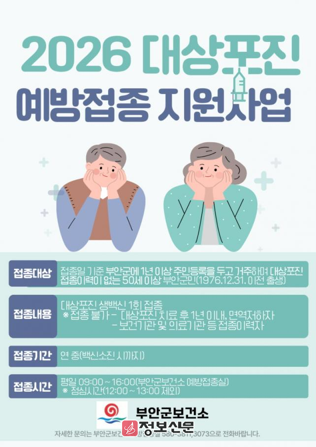 ![]() 부안군, 50세 이상 군민 대상포진 무료 예방접종 확대 시행 |
