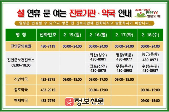 이번 설 연휴 기간 비상 진료 기관은 지역 응급의료 기관인 진안군 의료원을 비롯해 휴일 지킴이 약국 3개소로 일자별·당번제로 지정 운영된다. 2월 14일(토)에는 대부분의 관내 의료기관과 약국이 평상시와 동일하게 운영될 예정이다.