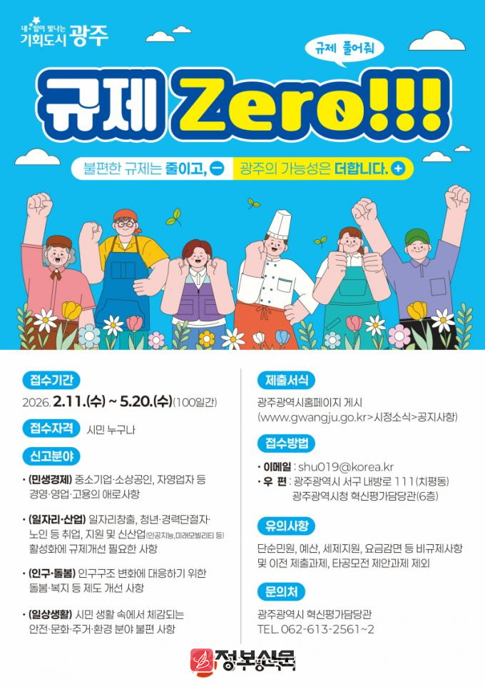 광주광역시(시장 강기정)는 ‘불합리한 규제 집중발굴, 규제 제로’를 목표로 11일부터 5월 20일까지 100일 동안 불합리한 규제 집중발굴 기간을 운영한다.