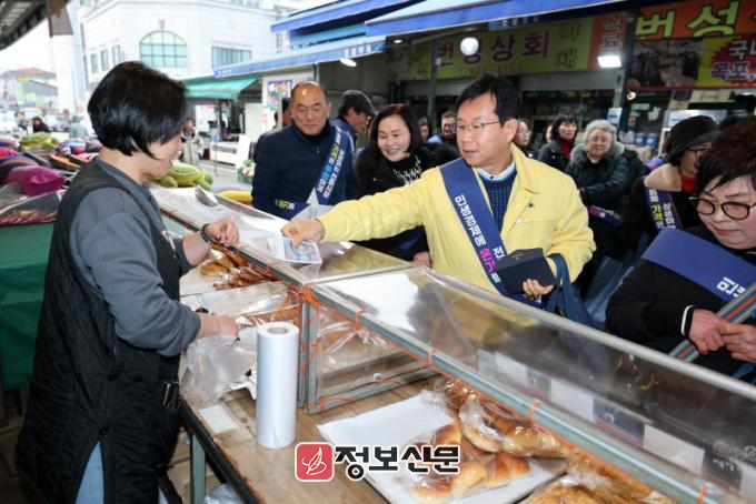 박병규 청장은 이날 민생 경제에 온기를 전하고 지역 상권에 활기를 불어넣기 위해 상인들을 격려하고 온누리상품권으로 제수 등을 구매했다. 또한 가격 표시 준수와 건전한 상거래 문화를 조성하기 위해 물가안정 캠페인도 병행했다.