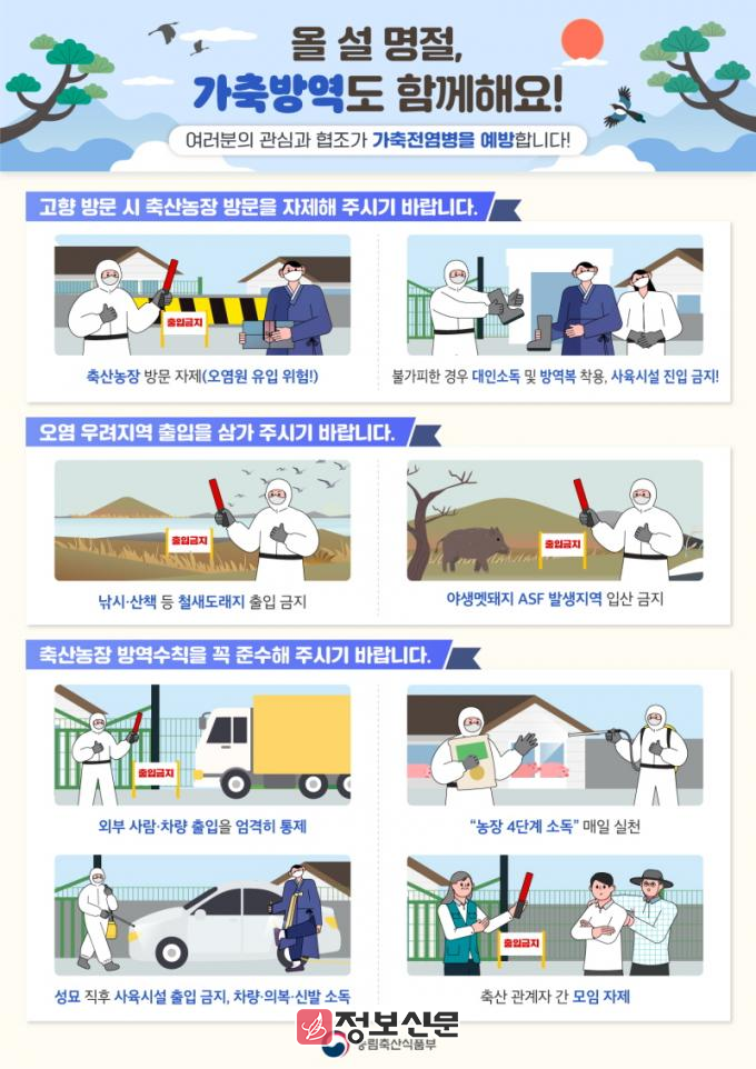 아울러 축산농가에는 방역 수칙 안내 문자를 발송하고 마을 방송을 통해 방역 지침을 지속적으로 안내하는 동시에, 귀성객을 대상으로 버스터미널과 주요 공공장소에 현수막을 게시해 축산농장 방문 자제를 당부하는 등 홍보 활동도 병행한다.