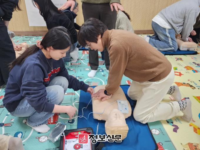 대한적십자사 광주전남지사와 연계하여 응급처치 이론교육(응급처치의 필요성, 상황별 응급처치 행동요령 등) 실습(심폐소생술(CPR), 자동심장충격기(AED) 사용법, 기도폐쇄 응급처치 등) 구성하여 교육 진행되었다.