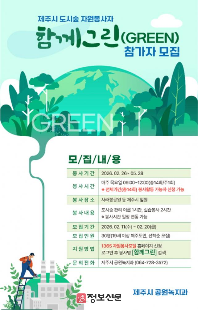 ![]() 제주시, ‘함께그린(GREEN)’도시숲 자원봉사자 모집 |