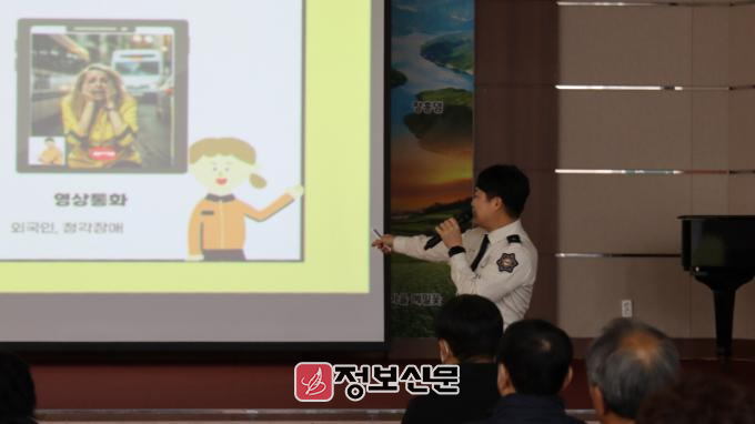 교육 내용은 ▲119신고 요령과 올바른 위치 알리기 ▲근무중 발생할 수 있는 주요질환(심장병, 뇌졸중, 저혈당, 경련, 온열질환)대처 방법 ▲119구급대 도착전까지 할 수 있는 간단한 응급처치 등으로 구성되어, 어르신들의 눈높이에 맞춘 설명과 실제 사례 중심으로 이뤄졌다.
