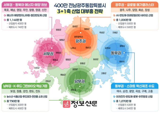 김 지사는 “전남광주통합특별시를 기존 광주권·서부권·동부권 3축 권역에 새로 남부권을 포함시켜 ‘3+1축’ 4대 권역으로 재편하겠다”며 “총 4천만 평 규모의 특화산업 단지와 첨단산업 신도시를 조성해 400만 특별시를 완성하겠다”고 밝혔다.