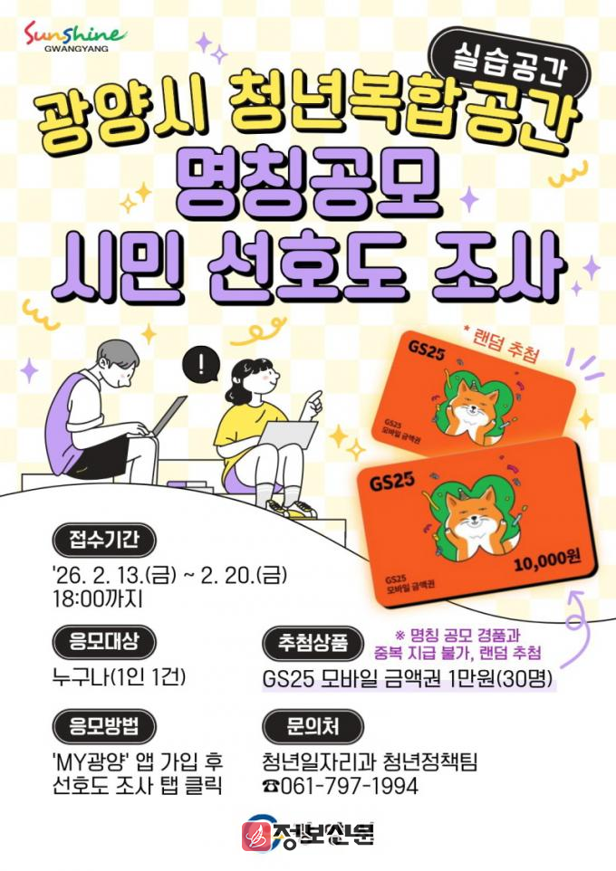 ![]() 광양시, ‘고향올래 청년복합공간(실습공간)’ 명칭 선호도 조사 실시 |