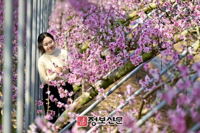 겨울철 한파 속에서도 철저한 보온 및 가온 관리로 안정적인 생육 환경을 유지한 결과, 하우스 내부를 가득 메운 복사꽃이 올해 고품질 복숭아 생산에 대한 기대를 높이고 있다.