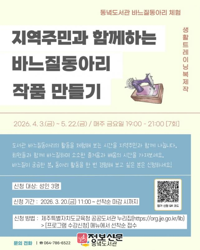 프로그램 참가 신청은 청소년 대상 ‘생각을 깨우는 독서토론’은 오는 11일 오전 11시부터, 성인 대상 ‘지역주민이 함께하는 바느질동아리 작품 만들기’는 오는 20일 오전 11시부터 제주특별자치도교육청 공공도서관 누리집을 통해 선착순으로 접수한다.