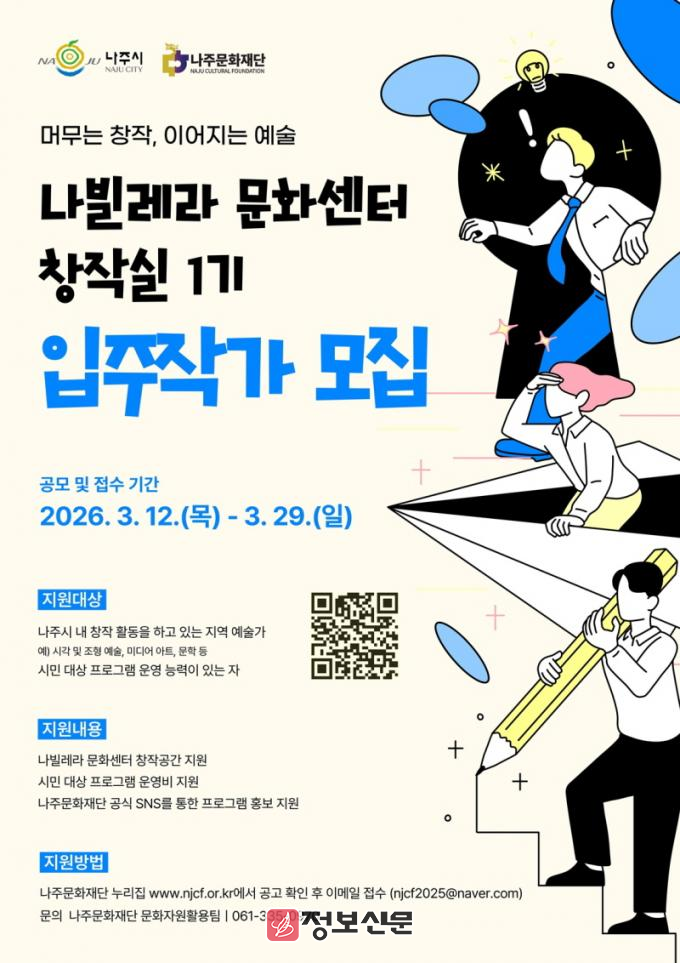 ![]() 나주문화재단, 나빌레라문화센터 창작실 입주작가 모집 |