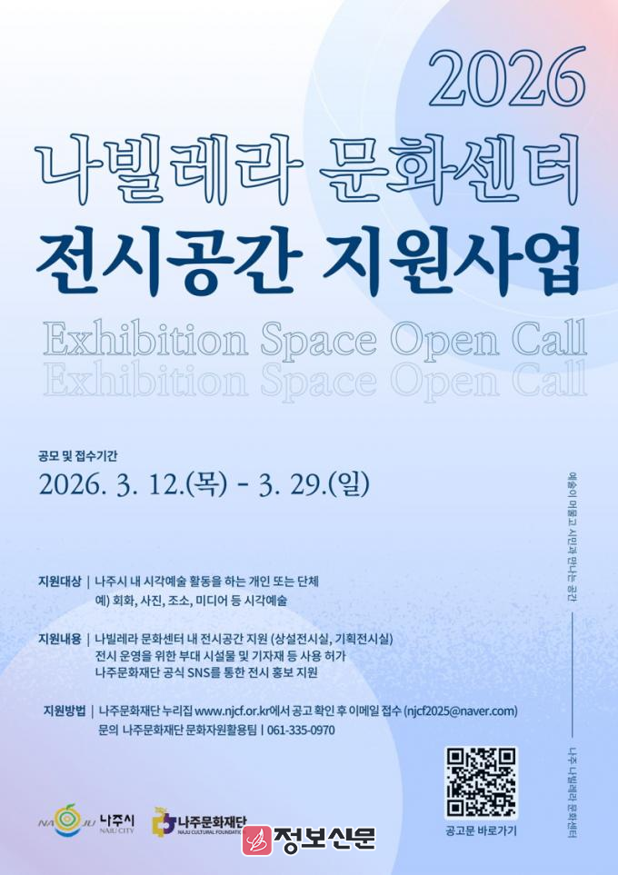 나주문화재단은 오는 3월 29일까지 지역 시각예술 작가와 단체를 대상으로 나빌레라문화센터 내 전시공간을 무상으로 지원하는 공모사업을 진행한다고 13일 밝혔다.