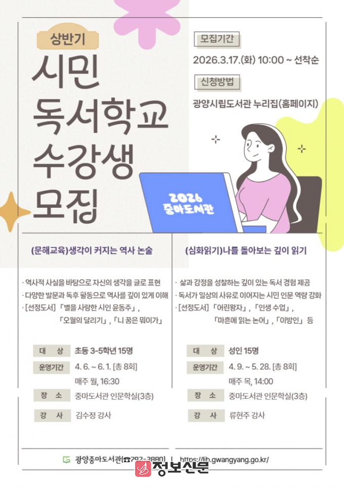 ![]() 광양중마도서관, 상반기 시민독서학교 수강생 모집 |