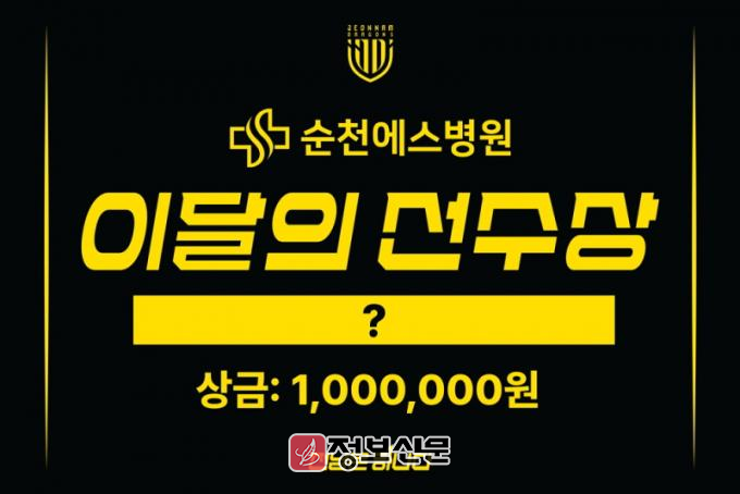 이와 함께 2026시즌부터 신설되는 ‘이달의 선수상’ 상금을 순천에스병원이 후원한다. 이에 따라 해당 상은 ‘순천에스병원 이달의 선수상’으로 운영된다. 월드컵 휴식기로 인해 1경기만 치러지는 6월을 제외하고, 3~5월 및 7~11월까지 총 8회에 걸쳐 월 100만원씩 시상하며, 시즌 종료 후에는 시즌 MVP에게 200만원을 별도로 수여한다. 총 후원 규모는 1,000만원 상당이다.