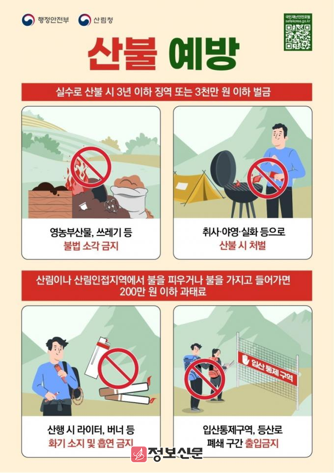이어 “산불 예방을 위해 입산 시 화기 소지를 금지하고, 산림 인접지역에서는 영농부산물이나 생활쓰레기 등을 태우지 않아야 한다”며 “화목보일러 사용 가정에서도 불씨 관리에 각별히 주의해 주시길 바란다”고 당부했다.
