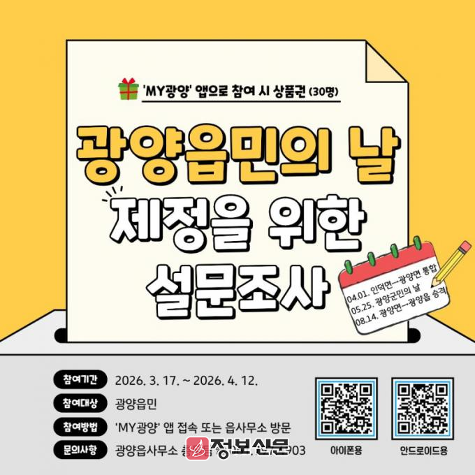 설문은 ▲읍민의 날 제정에 대한 찬성 여부 ▲기념일 선호 일자 등 총 2개 문항으로 구성됐다. 기념일 후보는 ▲4월 1일(인덕면, 광양면 통합일) ▲5월 25일(광양군민의 날 시행일) ▲8월 14일(광양군에서 광양읍 승격일) 등 3개 날짜 중 선택하는 방식이다.