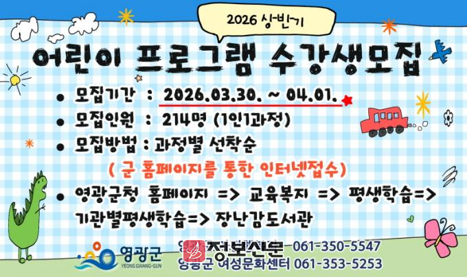 ![]() 영광군, 2026년 상반기 어린이 프로그램 수강생 모집 |