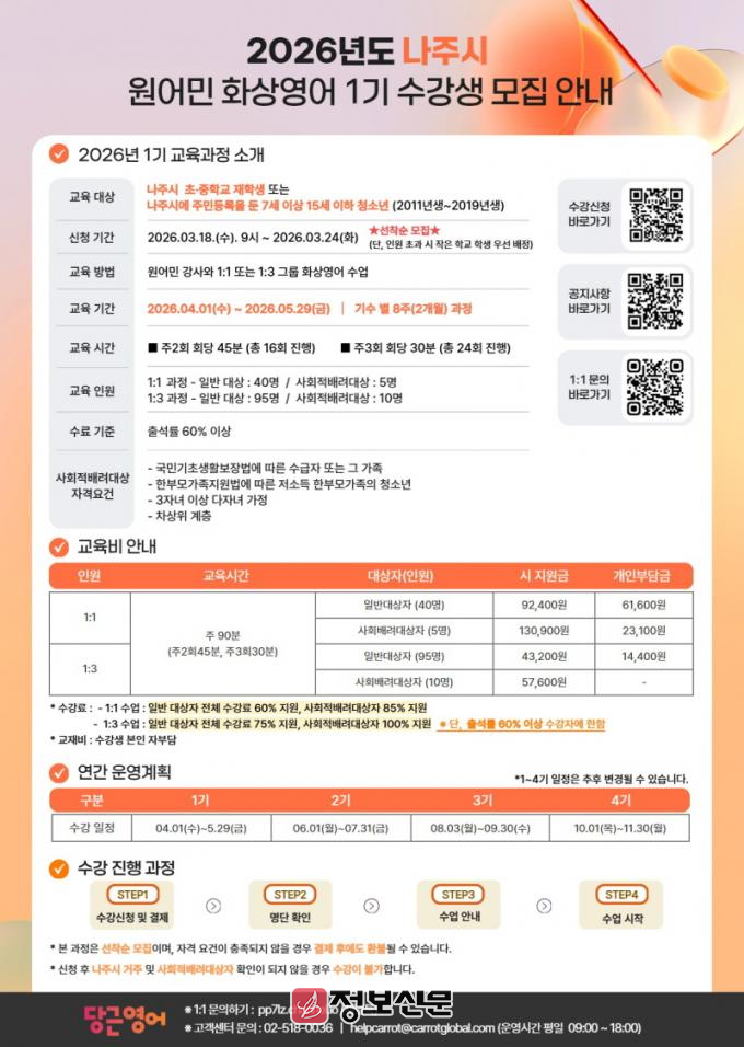 나주시는 오는 3월 18일부터 24일까지 관내 초‧중학생을 대상으로 ‘2026년 나주시 원어민 화상영어 1기’ 수강생 150명을 모집한다고 17일 밝혔다.