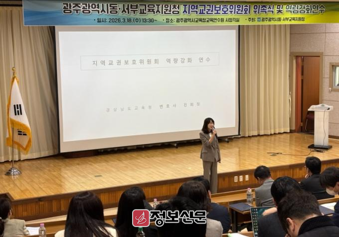 광주동·서부교육지원청은 이날 위원 위촉에 이어 전문성 강화를 위한 역량 강화 연수를 실시했다. 연수는 경상남도교육청 교권 전문 변호사가 ▲지역교권보호위원회 역할 ▲관련 법령의 이해 ▲심의 절차 및 운영 방법 등을 안내하는 내용으로 진행됐다.