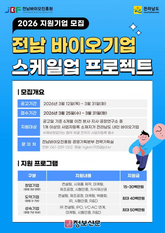 김기홍 전남도 전략산업국장은 “전남은 천연물과 해양생물 등 풍부한 바이오 소재와 화순백신산업특구, 전남바이오진흥원, 화순전남대병원 등 연구·임상 인프라를 갖춘 바이오산업 최적지라며, 이번 스케일업 프로젝트를 통해 유망 바이오기업을 체계적으로 육성해 전남을 바이오산업의 핵심 성장거점으로 만들겠다”고 말했다.